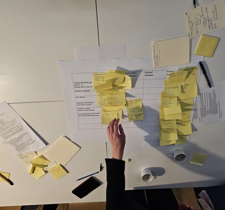 The first phase of the workshop was devoted to immersion in the narratives. After this, each group began with the analysis of a “TOSA” (Threats, Opportunities, Stakes, Actions) framework adapted by the IMMER team. Participants were encouraged to think creatively and immerse themselves deeply in the scenarios. The analyzed societal sectors included energy (electricity, gas, oil), mobility, water, information systems, social cohesion, and territorial self-organization. The findings are structured according to the four dimensions of the TOSA framework—Threats, Opportunities, Stakes, and Actions—and are summarized for each scenario using bullet points that capture the most significant insights and proposals from the participants.